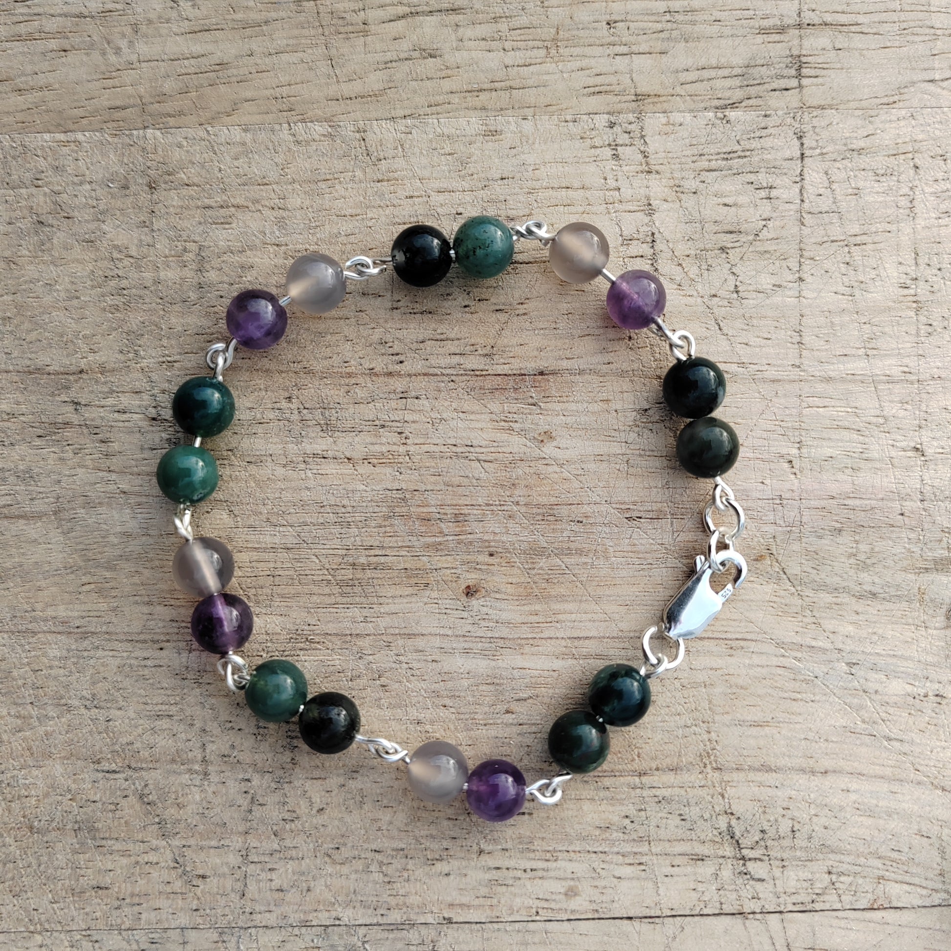 Amethyst is paired with dreamy grey or mirror agate, and these pairs alternate with pairs of moss agate.